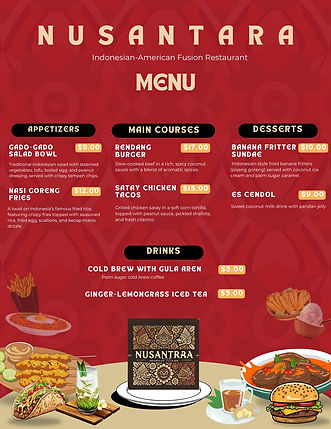 As a team, we developed a diverse and culturally thoughtful menu. I contributed to the ideation, portion planning, and pricing strategies. Our goal was to make Indonesian flavors approachable to a wider audience, while still staying true to our roots.
